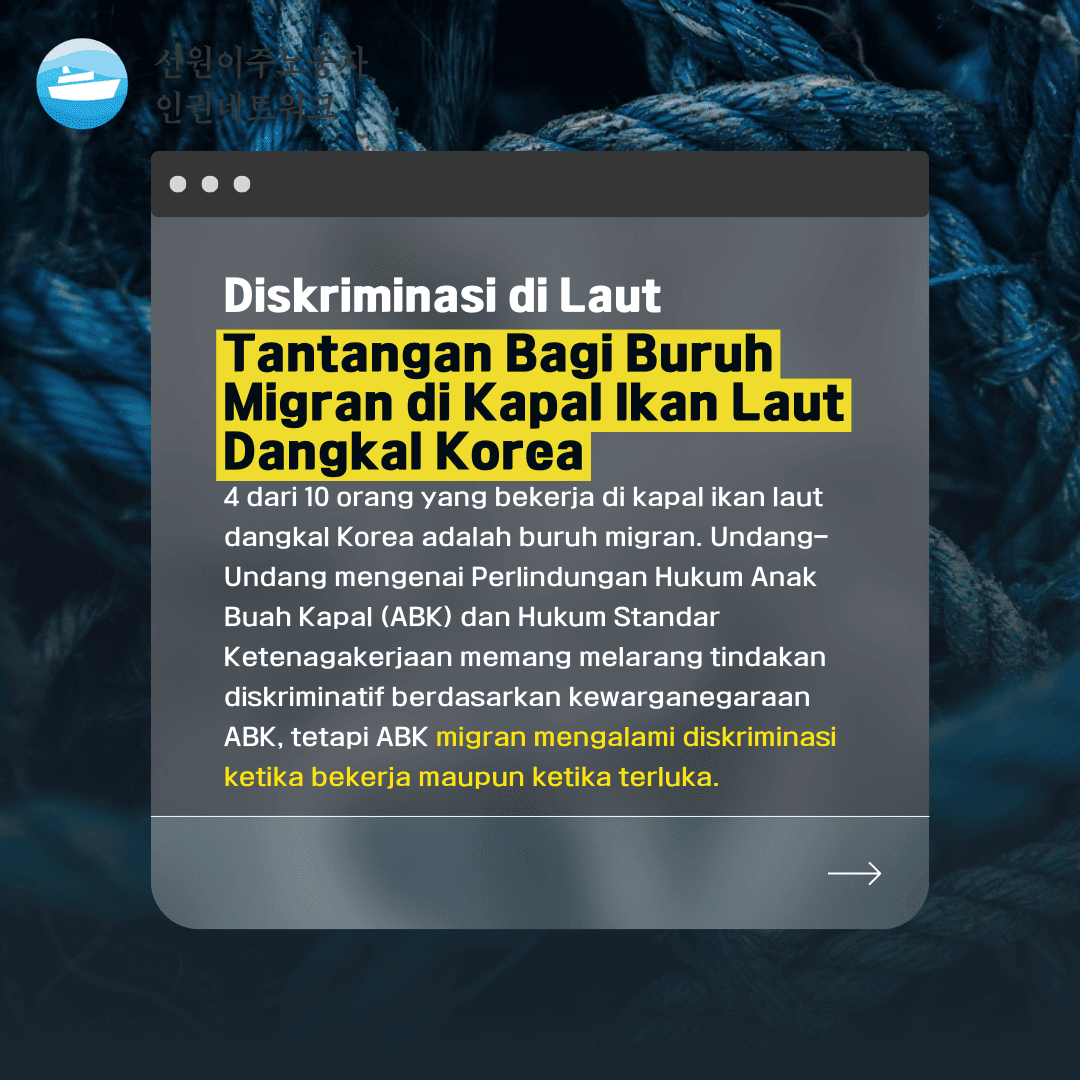 4 dari 10 orang yang bekerja di kapal ikan laut dangkal Korea adalah buruh migran. Undang-Undang mengenai Perlindungan Hukum Anak Buah Kapal (ABK) dan Hukum Standar Ketenagakerjaan memang melarang tindakan diskriminatif berdasarkan kewarganegaraan ABK, tetapi ABK migran mengalami diskriminasi ketika bekerja maupun ketika terluka.